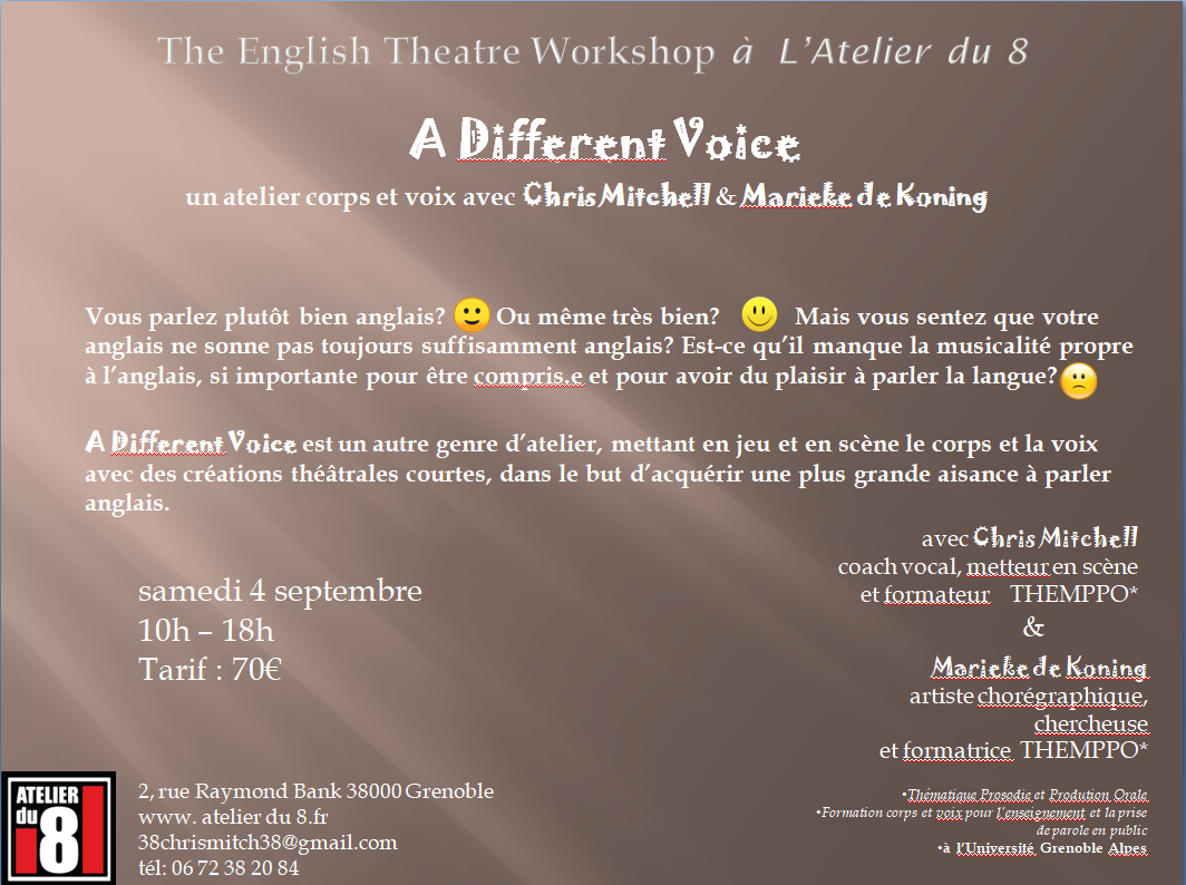 A Different Voice est un autre genre d’atelier, mettant en jeu et en scène le corps et la voix avec des créations théâtrales courtes, dans le but d’acquérir une plus grande aisance à parler anglais.